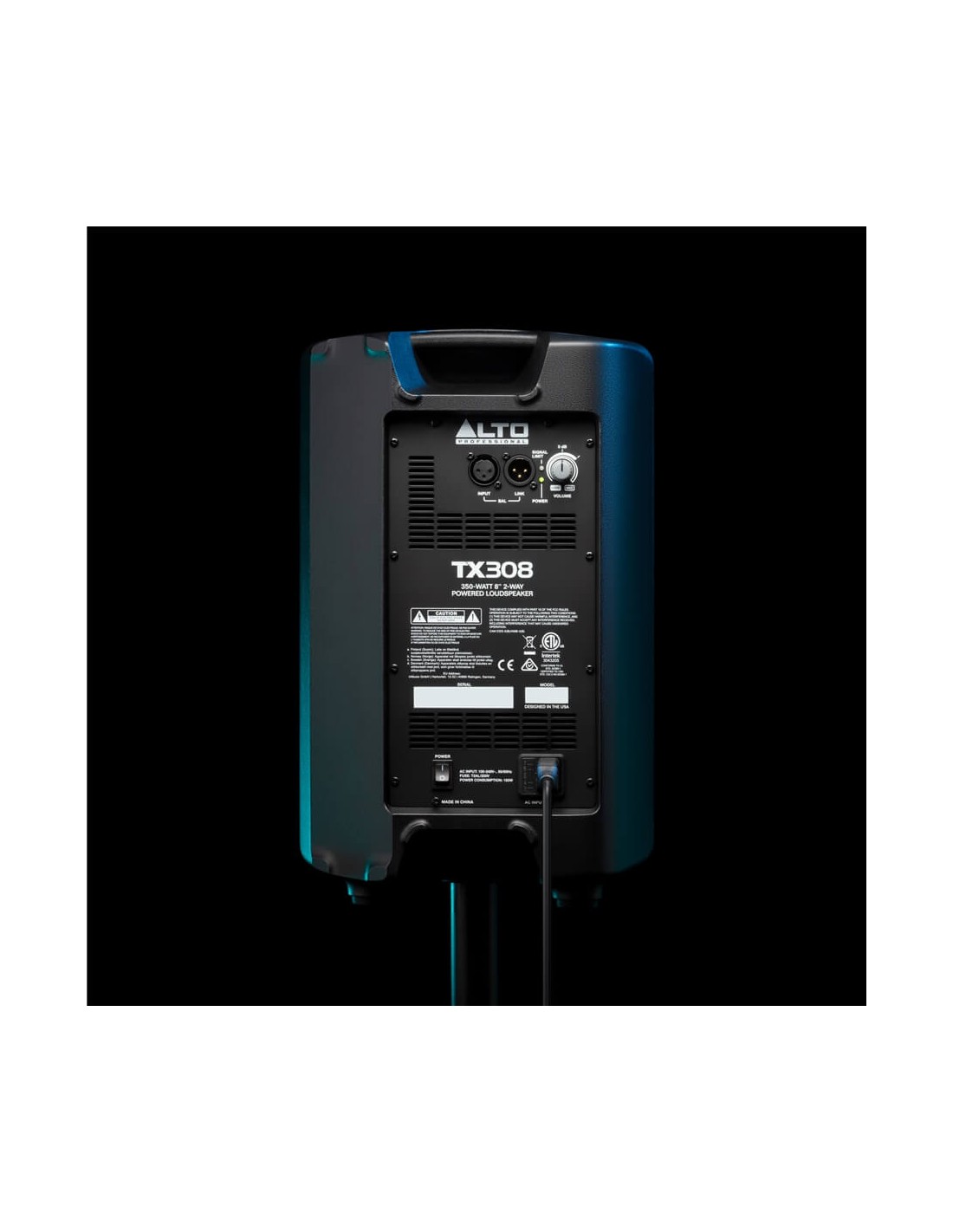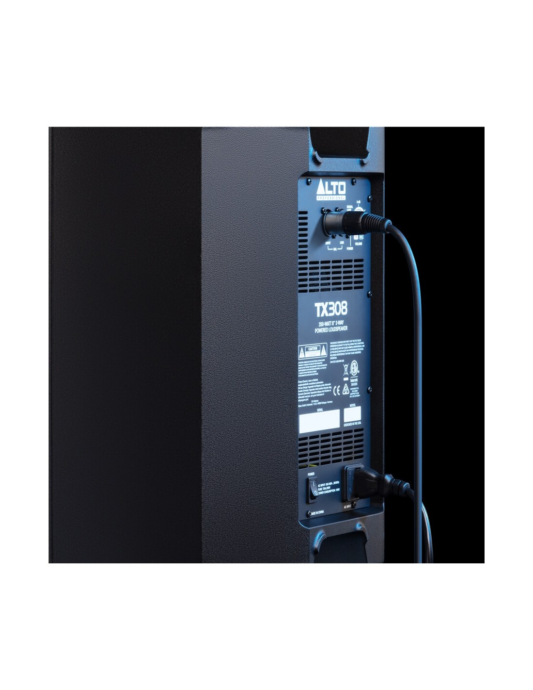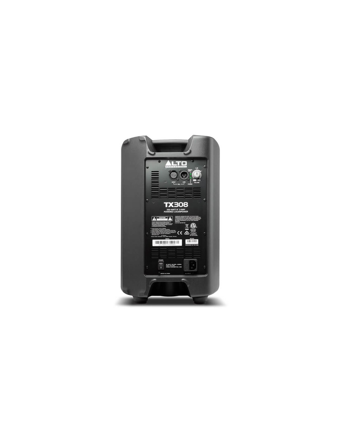 La cassa TX308 della Alto Professional impiega un sistema di amplificazione a 2 vie con crossover attivo (2.500Hz), un woofer da 8" dalla lunga escursione e un tweeter a compressione con diaframma in titanio da 1" installato all'interno di una trama che permette alle frequenze alte di clipping (limite analogico) e l'overload dei circuiti.