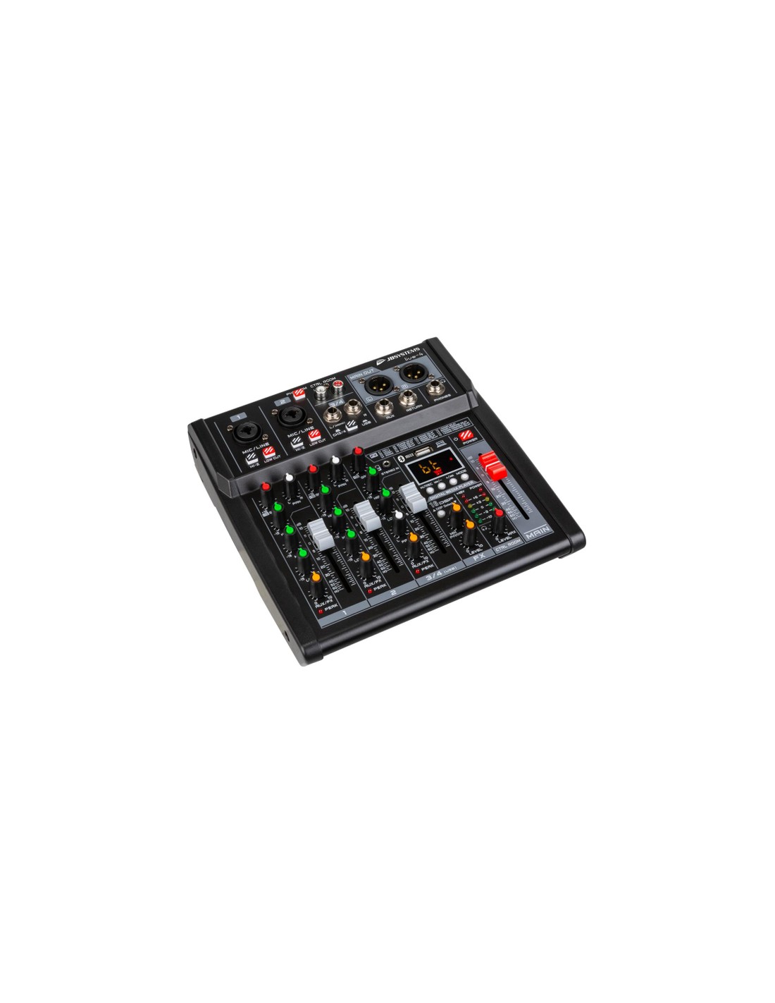 - 4 ingressi su 3 canali (2 microfono/linea, 1 mono/stereo linea/aux/USB/lettore BT)