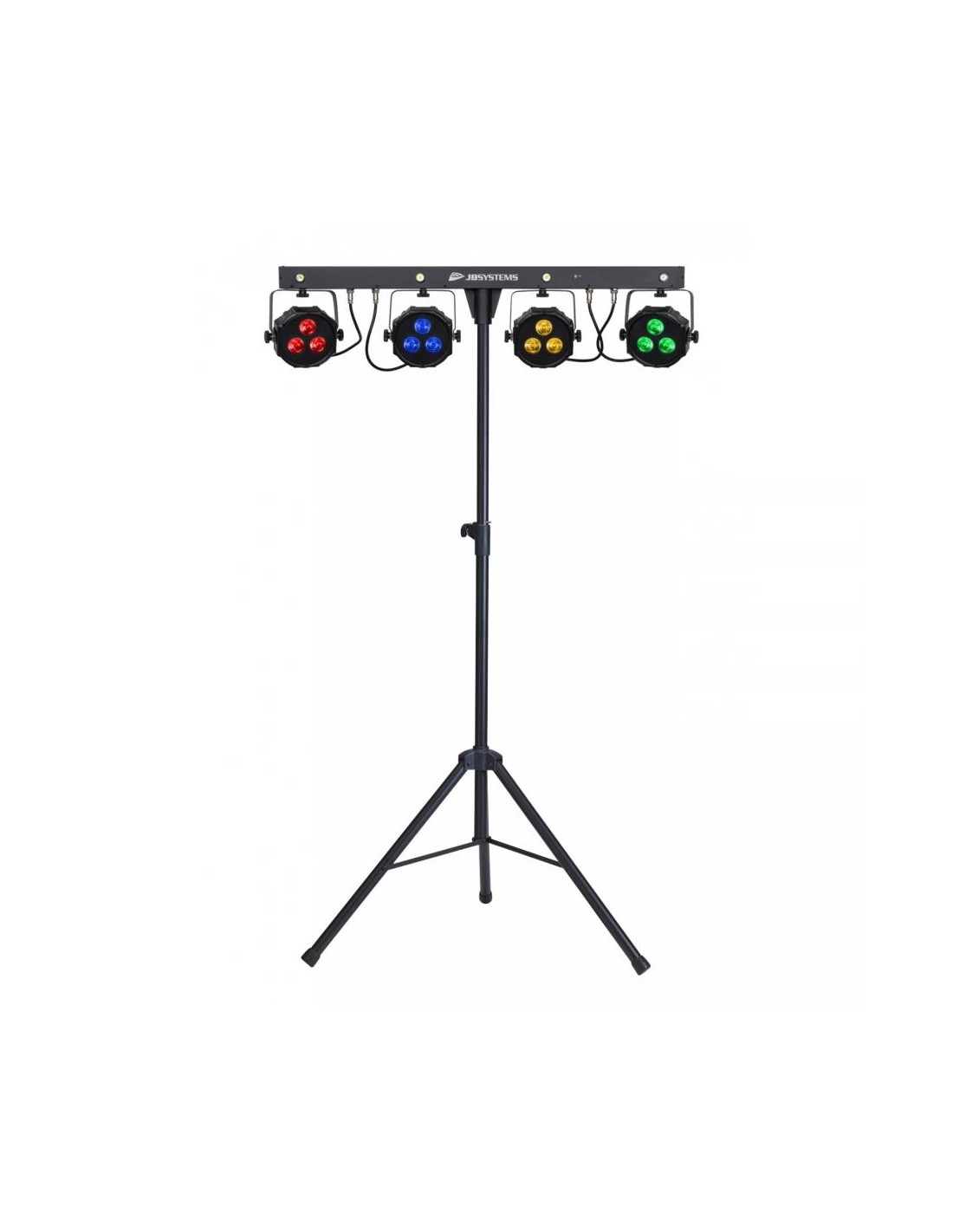 | Un set completo di luci pronto all'uso per tutti i tuoi eventi e feste: un compatto 4 BAR alimentato, controller a pedale wireless, supporto per luci e borse per il trasporto |