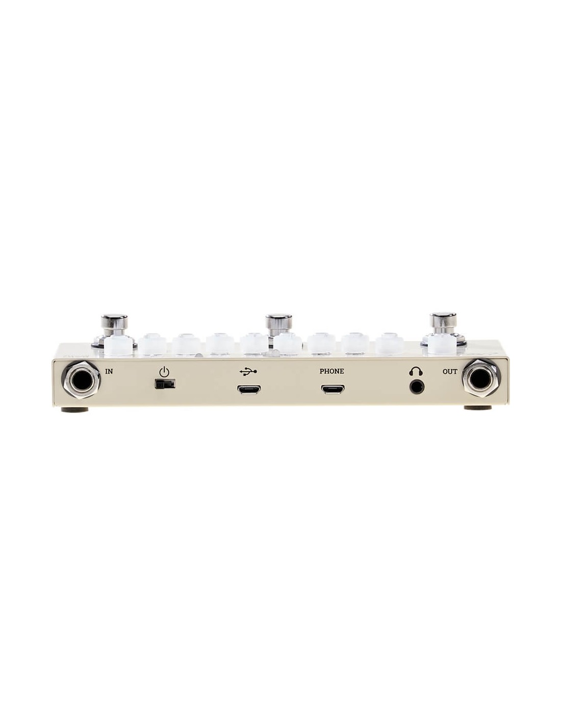 Dal Blues al Metal avrai la possibilità di utilizzare live e in studio una selezione di amplificatori, cabinet, speaker e microfoni appositamente combinati per offrire un suono realistico e convincente. Con il controllo Out gestisci il volume in uscita e tramite i tre pulsanti a pedale potrai passare dalla modalità Preset per il cambio degli stessi, alla modalità Live che ti permetterà di gestire separatamente IR/Rev, Delay/Mod e Preamp. Sempre con gli switch a pedale, puoi azionare il Bluetooth che ti consentirà di riprodurre le tue backing track preferite tramite un device esterno o attivare l'accordatore integrato, con il quale è possibile anche interrompere completamente il segnale in uscita (mute).