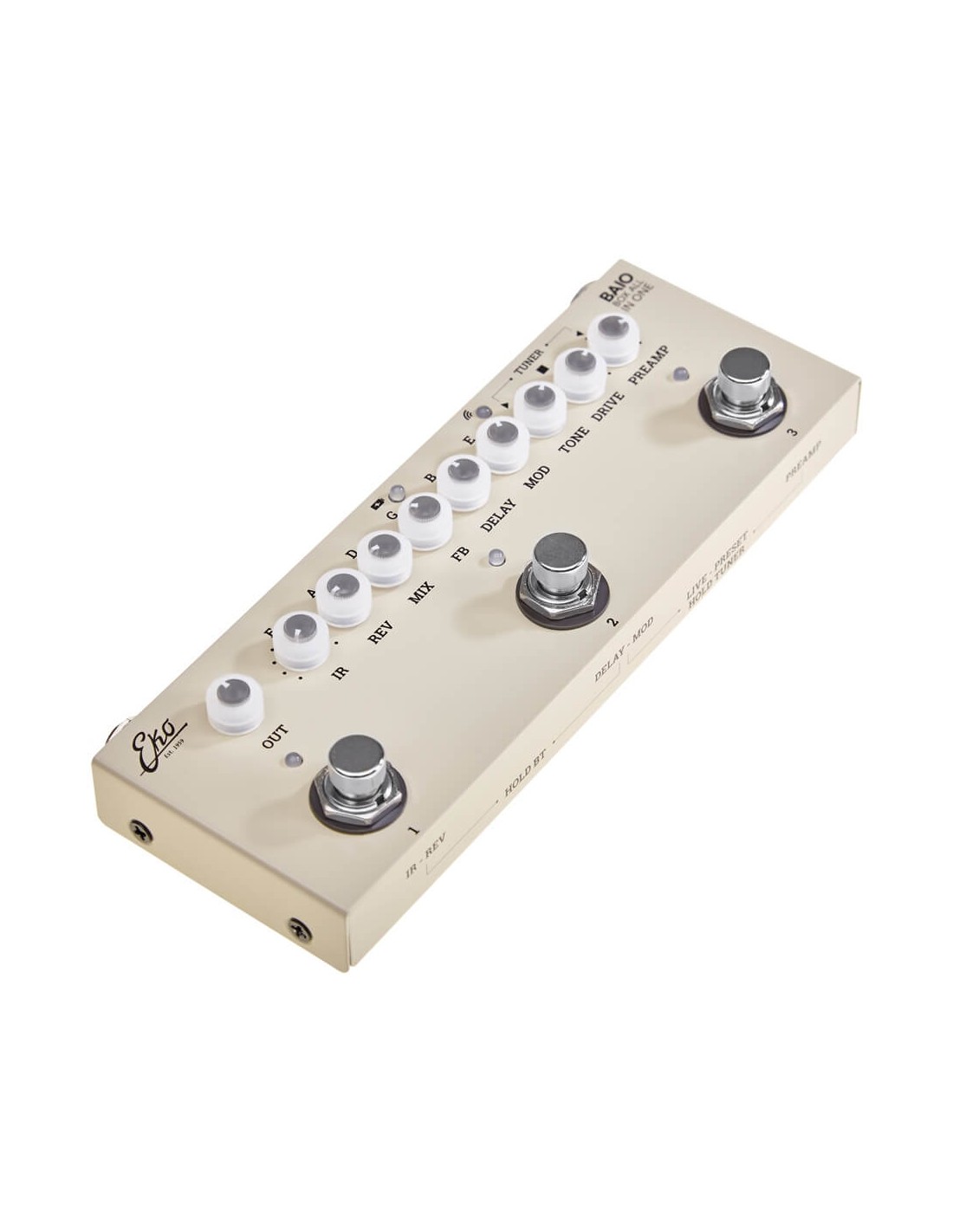 Il BAIO (Box All In One) di Eko Guitars è il pedale multieffetto completo e portatile, pensato per la tua chitarra. Nove tipi di preamplificatore integrati, otto Impulse Response ed effetti di modulazione, delay e riverbero inclusi ti permetteranno di gestire completamente il tuo suono. Provalo come scheda audio con il tuo pc o smartphone e sfrutta il BT per suonare sopra le tue backing track.